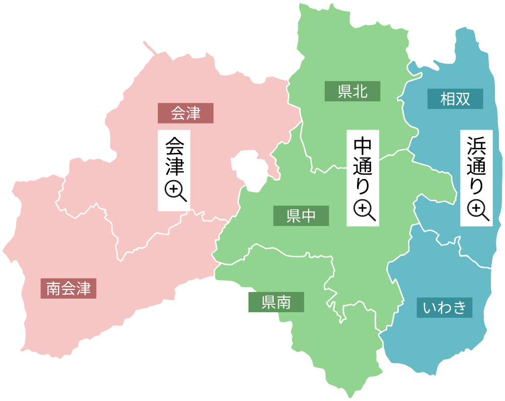 浜通り、中通り、会津の3地域の特徴、それぞれの産業の特徴について説明します。 地図上の地域名をクリックすると、詳細情報が表示されます。